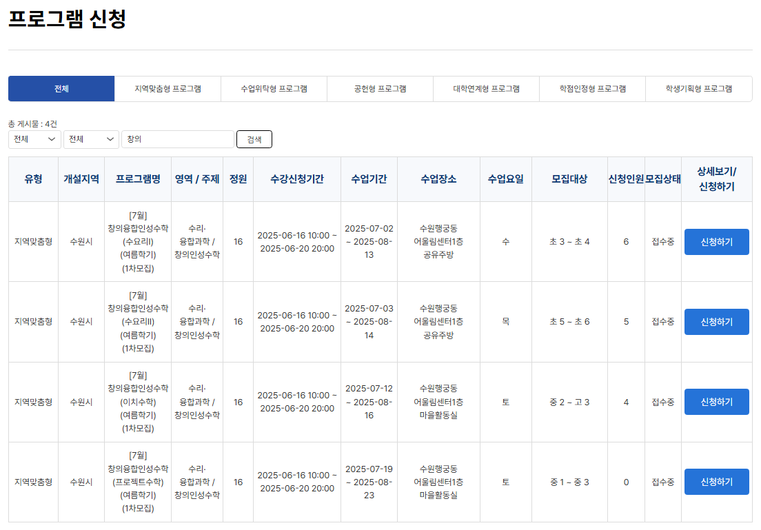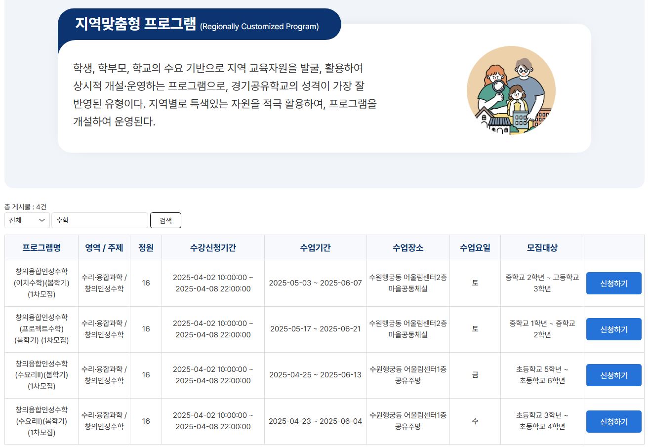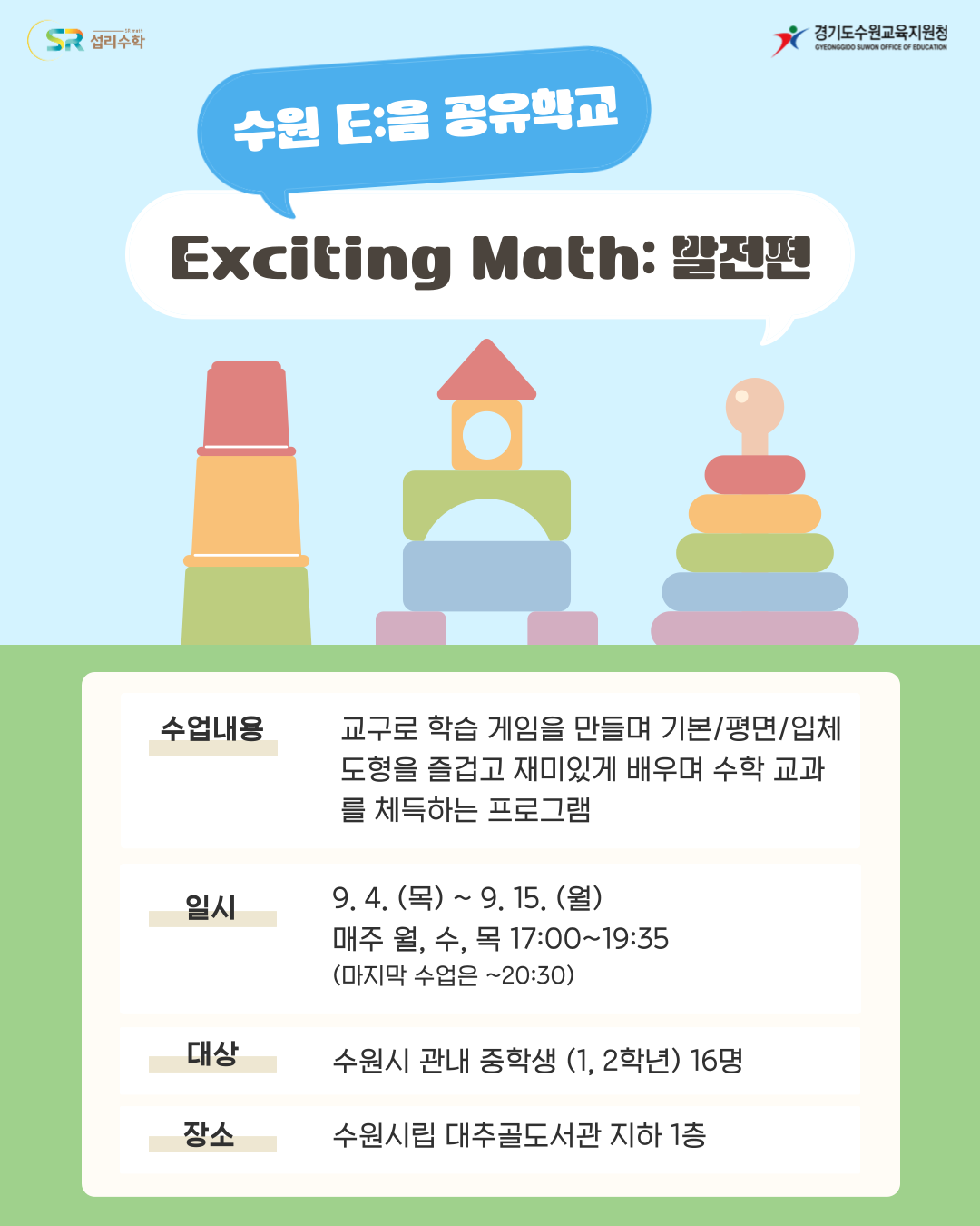 안녕하십니까.^^섭리수학에서 경기공유학교 가을학기 수업을 진행하게 되어 수강 신청 진행중입니다.9. 22.(월)부터 경기공유학교 사이트(https://gong-u.goe.go.kr/)에서 신청하실 수 있으며,봄/여름/가을 학기 각기 다른 내용으로 진행될 예정입니다. 1) 요리와 미션으로 수학을 깨우치는 수요리I (초3~4, 10월 15일(수) 시작, 주 1회 7주)2) 요리와 미션으로 수학을 깨우치는 수요리II (초5~6, 10월 17일(금) 시작, 주 1회 7주)3) 게임을 만들며 수학을 깨우치는 Exciting Math (초5~6, 10월 16일(목) 시작, 주 1회 6주)4) 심리 실험을 설계하며 수학을 깨우치는 프로젝트수학 (중1~고1, 10월 18일(토) 시작, 주 1회 6주)5) 수학으로 세상..